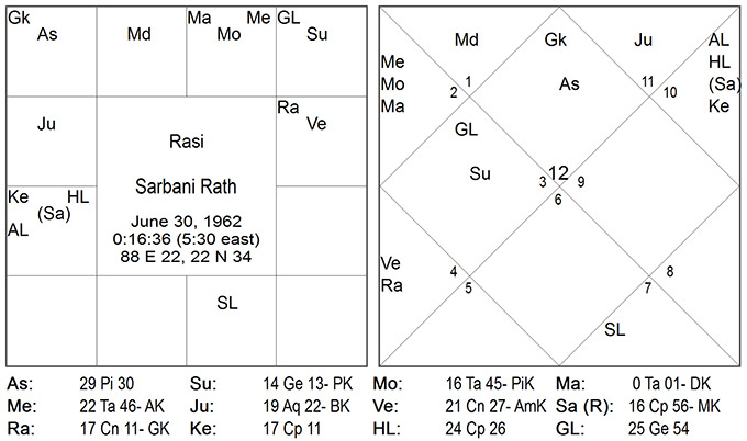 The above chart is the Somanāth Horā (D2-S) of the standard nativity. Now see the horoscope of his wife Sarbani. Without her huge organisational skills and effort all these courses may never have seen the light of the day.